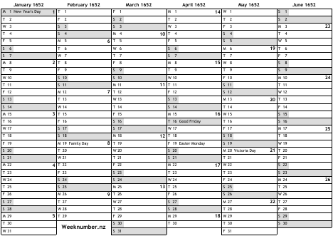 1652 calendar
