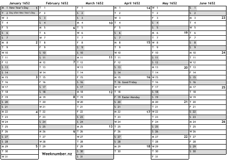 1652 calendar