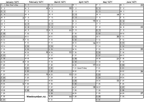 1671 calendar